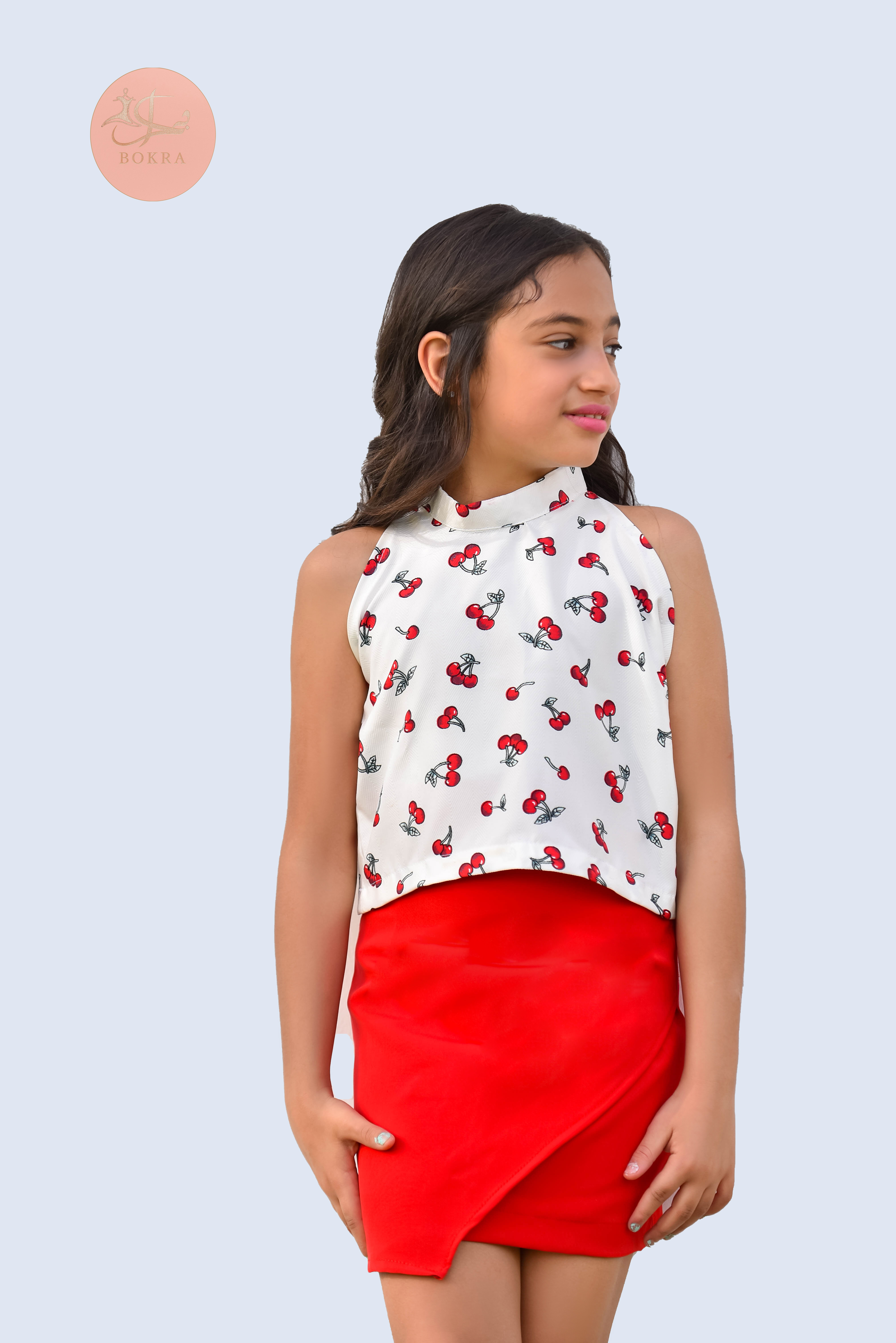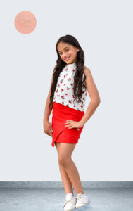 Our summer top with cherry prints paired with a bright red wrap skirt — perfect for your little girl’s playful and stylish days.